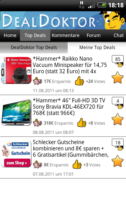 Der mobile DealDoktor zeigt auf seiner Startseite alle frischen Deals mit Bild und kurzem Text. Ein Fingerzeig reicht an dieser Stelle bereits aus, um die Detailansicht mit allen wesentlichen Fakten zu laden. Hier gibt es nicht nur eine ausführliche Beschreibung eines Deals: Die App weist auch gleich ganz konkret das Sparpotenzial in Euro aus und zeigt, wie viele User-Votes es bereits gegeben hat. Die Kommentare der Community lassen sich an Ort und Stelle abrufen, denn gerade durch die Chance zur Bewertung kann der DealDoktor sofort deutlich machen, ob ein Schnäppchenangebot wirklich so toll ist, wie es klingt.