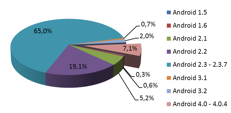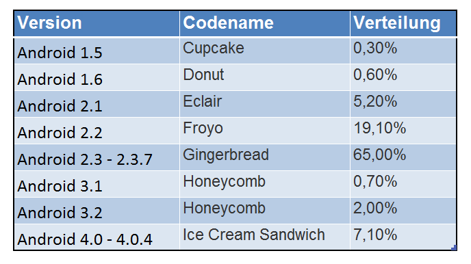 Ganz vorne liegt nach wie vor Gingerbred (Android 2.3) mit einem Anteil von 65%. Froyo (Android 2.2) schafft es mit 19,1% auf Platz 2, gefolgt von Ice Cream Sandwich. ICS hat nun also bereits Eclair hinter sich gelassen. Um den Wert von Froyo zu schaffen, muss ICS noch einen langen Weg gehen. Erst recht, um Gingerbred zu überholen.