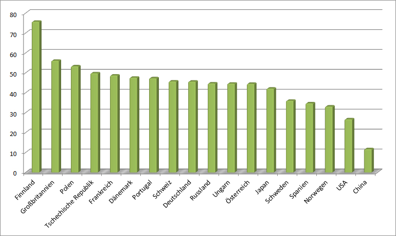 Wie erwähnt sind die Amerikaner am kommunikativsten. Die Kategorie „Kommunikation“ schafft es auf 15,8% Anteil. Ebenfalls recht mitteilsam sind die Schweden (12,5%), die Norweger (7,5%) und die Chinesen (9,8%). Die Deutschen, Österreicher und Schweizer liegen hier mit je ca. 1,7% Anteil recht weit hinten.