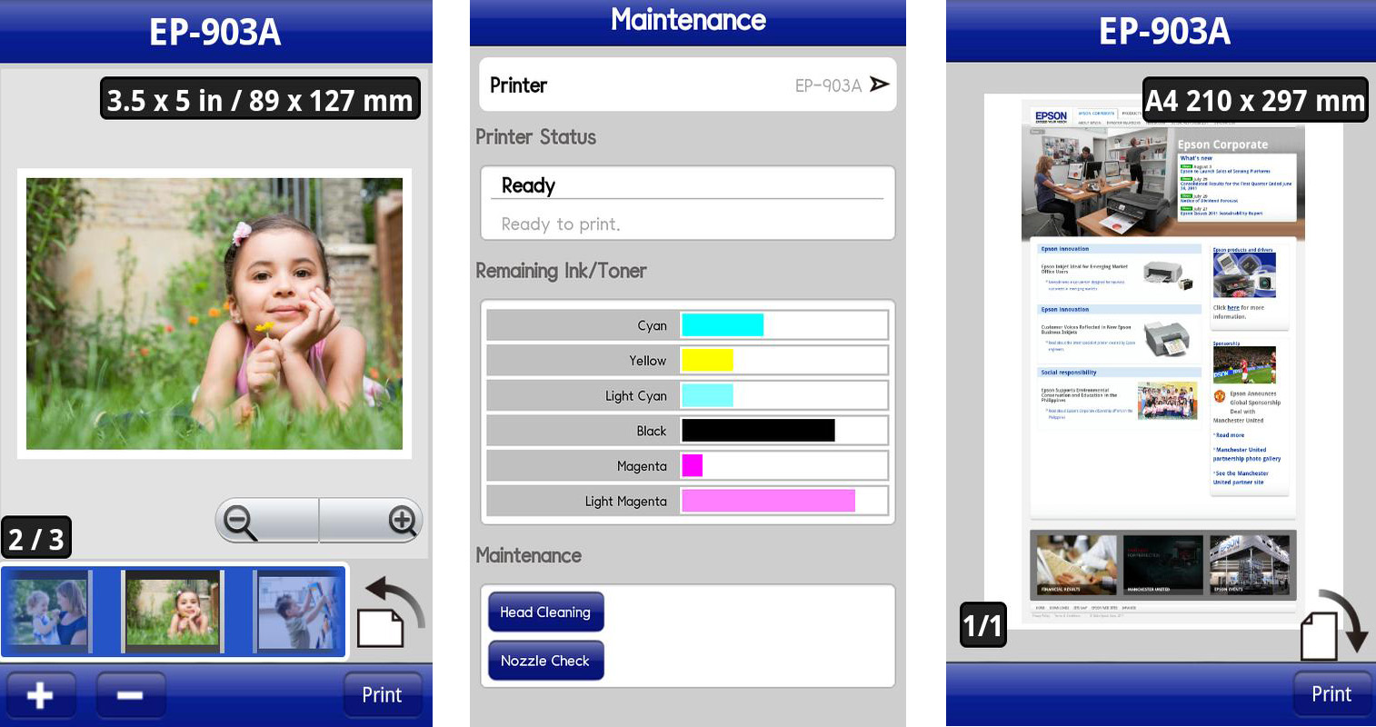 Mit der App können Sie aber auch den Status oder den Tintenstand des Druckers überprüfen, das Papierformat und den Papiertyp wählen. Darüber hinaus lässt sich der Seitenbereich konfigurieren oder die Anzahl der Kopien. Drucken kann man neben Dokumenten aber natürlich auch Fotos. Und noch ein Detail am Rande: Epson liefert sogar einen integrierten Browser mit, mit dem das Ausdrucken von Webseiten natürlich besonders schnell abläuft.