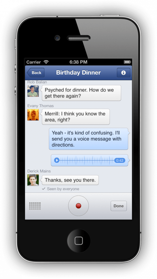 Das jüngste Update der Facebook Messenger-App bringt einen Record-Button neben die Kamera- und Foto-Option. Durch drücken und halten des Buttons wird der Aufzeichnungsvorgang für eine Sprachnachricht gestartet. Sobald ihr den Text gesprochen habt, könnt ihr diesen durch loslassen senden oder durch ein Wischen verwerfen.