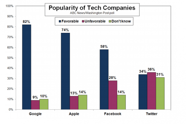 Unglaubliche 82 Prozent der Amerikaner haben eine positive Meinung von Google. Damit liegt die Marke des Suchmaschinenriesens um ganze 8 Prozentpunkte vor Apple, das den zweiten Platz einnimmt.  Gefolgt übrigens von Facebook mit 58 Prozent. Noch weniger als von Facebook halten die Amerikaner übrigens von Twitter. Diese Marke schaffte bei der Frage nach der Favorisierung  nur 34 Prozent Zustimmung. Auffallend dabei ist, dass beinahe ebenso viele Menschen negativ über Twitter denken. Und selbst bei den Jugendlichen wird Twitter nur von 42 Prozent positiv gesehen, bei den Senioren fällt dieser Wert gar auf 18 Prozent ab.