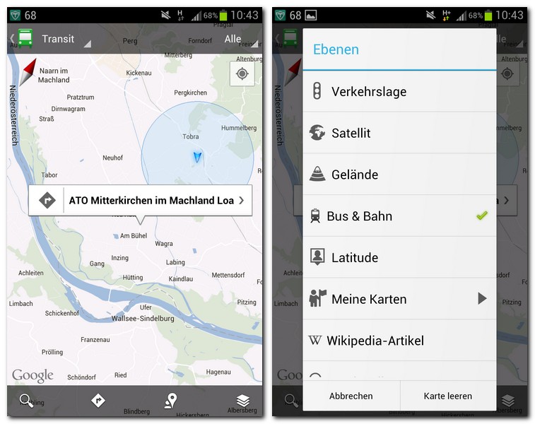Mit der neuen Version 6.1 hat Google die Karten der Verkehrslinien-Ebene angepasst. Dadurch ist es jetzt möglich, zwischen Zug, Bus oder U-Bahn und somit eine spezielle Art der Fortbewegung auszuwählen. Außerdem wird die Ankunftszeit von den Zügen bzw. Bussen sowie die Entfernung zu anderen Stationen in der App angezeigt.