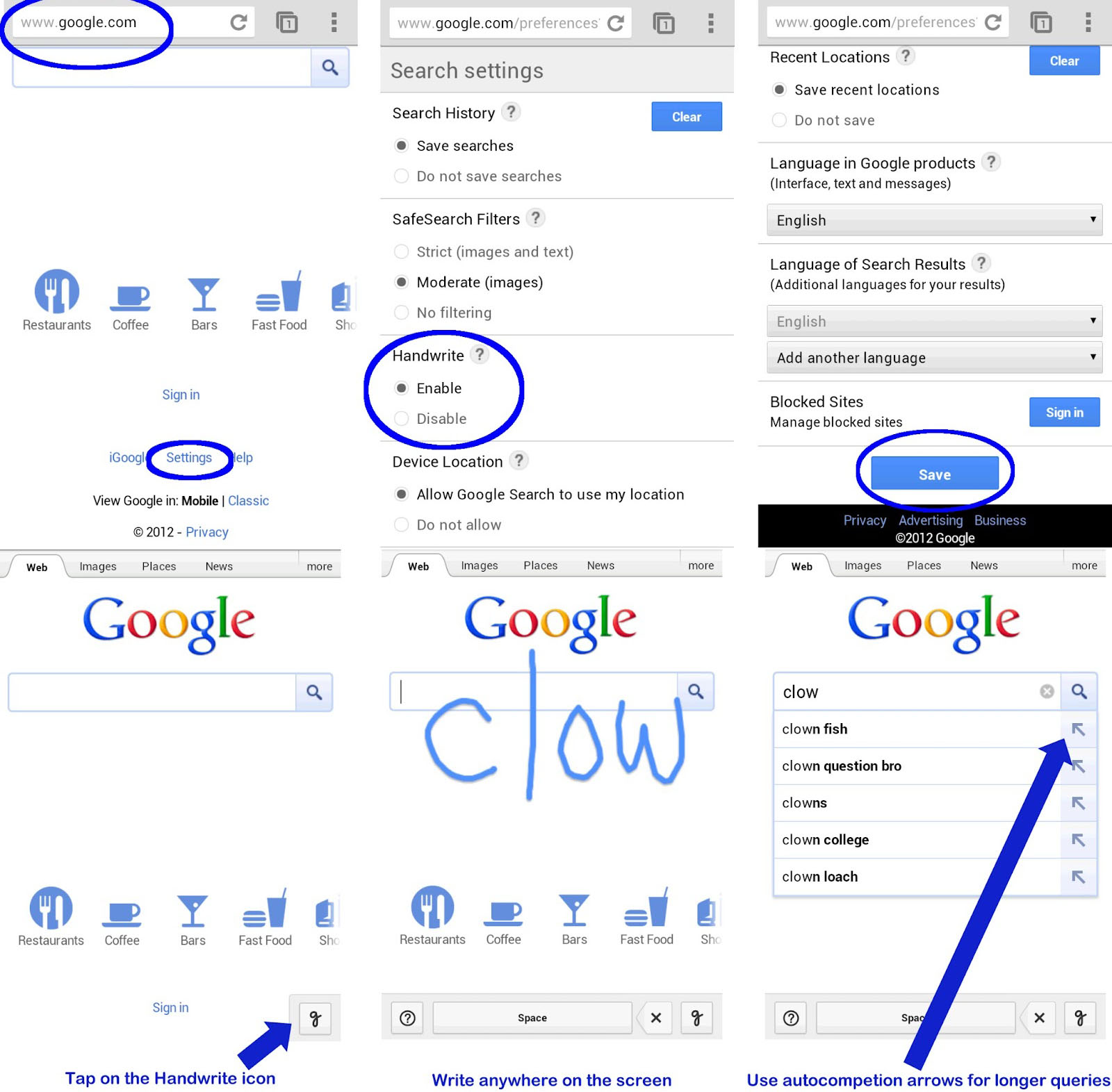 Um die Suche nach Begriffen etwas einfacher zu gestalten hat Google auf der Homepage jetzt eine neue Funktion eingeführt, mit der man handschriftliche Eingaben tätigen kann.Alle Android-Smartphones ab der Version 2.3 haben Zugriff auf die neueste Funktion von Google. In den Einstellungen der Google-Suchmaschine könnt ihr unter “Handschrift” die Funktion aktivieren. Damit könnt ihr jetzt auf der Homepage einfach mit dem Finger schreiben. Google setzt das Geschriebene dann in die Suchleiste ein und bietet euch, wie üblich, Suchvorschläge an. Bei Tablets funktioniert die Eingabe erst ab Version 4.0.