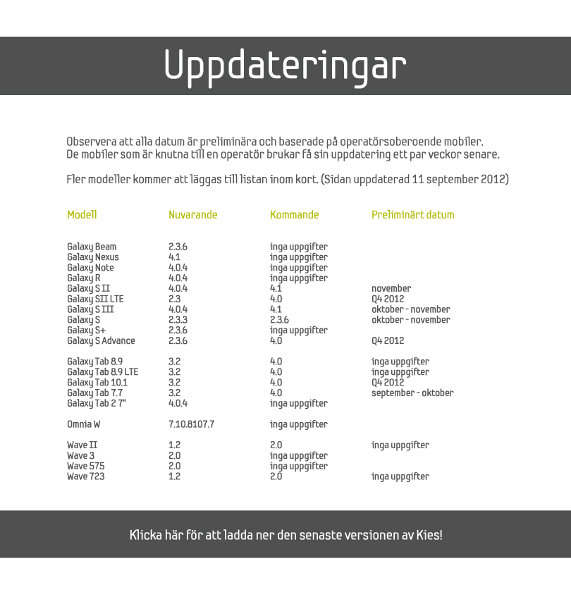 Auf der Facebook-Seite von Samsung-Schweden wurde ein Update-Plan veröffentlicht, auf dem einige Geräte aufgelistet sind. Darunter sind auch das Galaxy S2 sowie der Nachfolger, das S3.