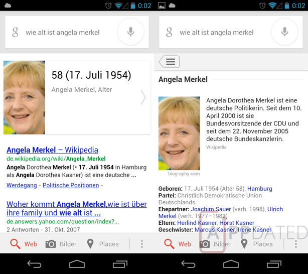 Links seht ihr die Suchergebnisse des alten Google Now, während rechts der Knowledge Graph zum Einsatz kommt. (Foto: Appdated)