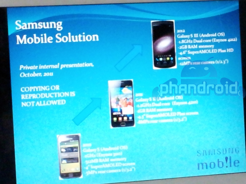 Die Geschichte geht so: Ein anonymer Informant hat sich kürzlich bei den Kollegen von Phandroid mit brandheißen, „total geheimen“ Galaxy S3 Infos gemeldet. Im Gepäck hatte er ein internes Samsung Dokument (siehe Screenshot), das die Entwicklungsgeschichte der Galaxy S Reihe illustrieren sollte. Alles begann mit dem Galaxy S. Dann sehen wir ein Foto des äußerst erfolgreichen Galaxy S2 und an dritter Stelle folgt ein bislang unbekanntes Gerät. Es trägt den verheißungsvollen Namen „Galaxy S3“ und heizt seitdem die Spekulationen auf sämtlichen Android Blogs kräftig an. Das angebliche Beweisdokument entstammt einer Firmenpräsentation, die von Samsung Mobile Solution für Mobilfunkhersteller und Handelspartner abgehalten wurde. Über die Glaubwürdigkeit der Quelle ist bislang nichts bekannt.
