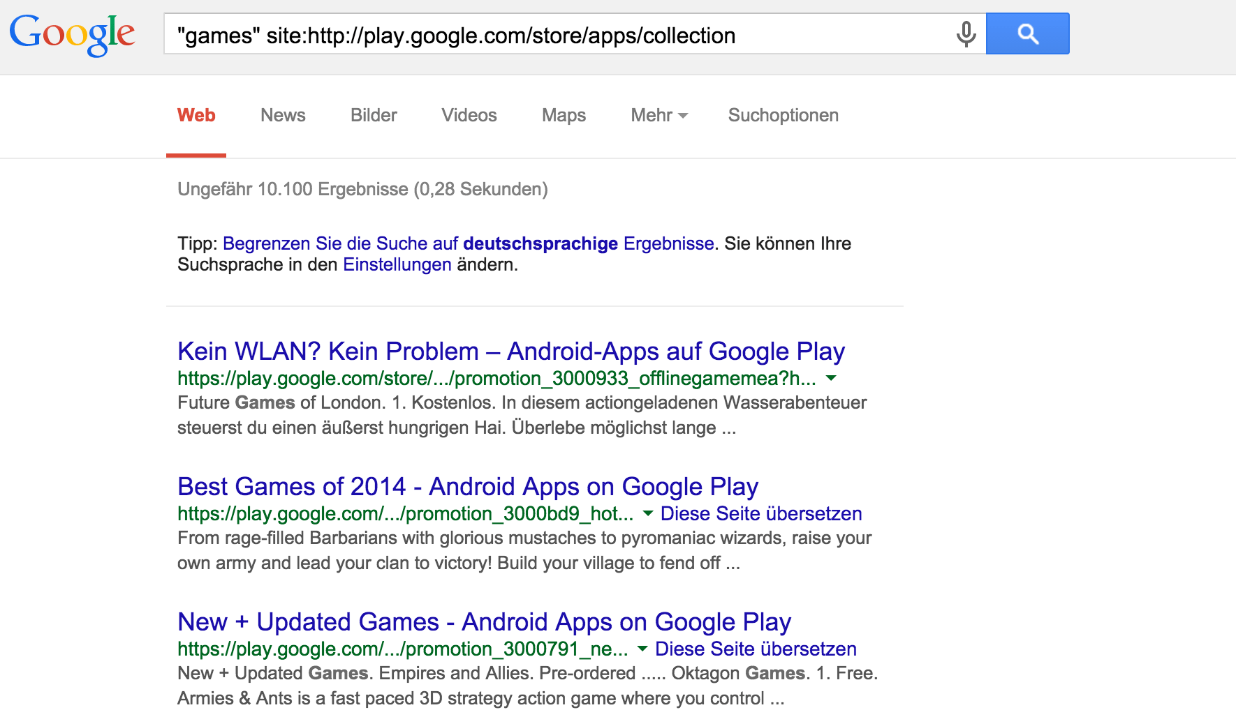 Der Play Store, Googles Softwareladen für Android, ist nicht nur auf Smartphones und Tablets verfügbar, sondern auch im Netz als ganz normale Webseite. Was läge also näher, als Googles Power als Suchmaschine zu nutzen und so den Play Store nach passenden Apps zu durchsuchen?