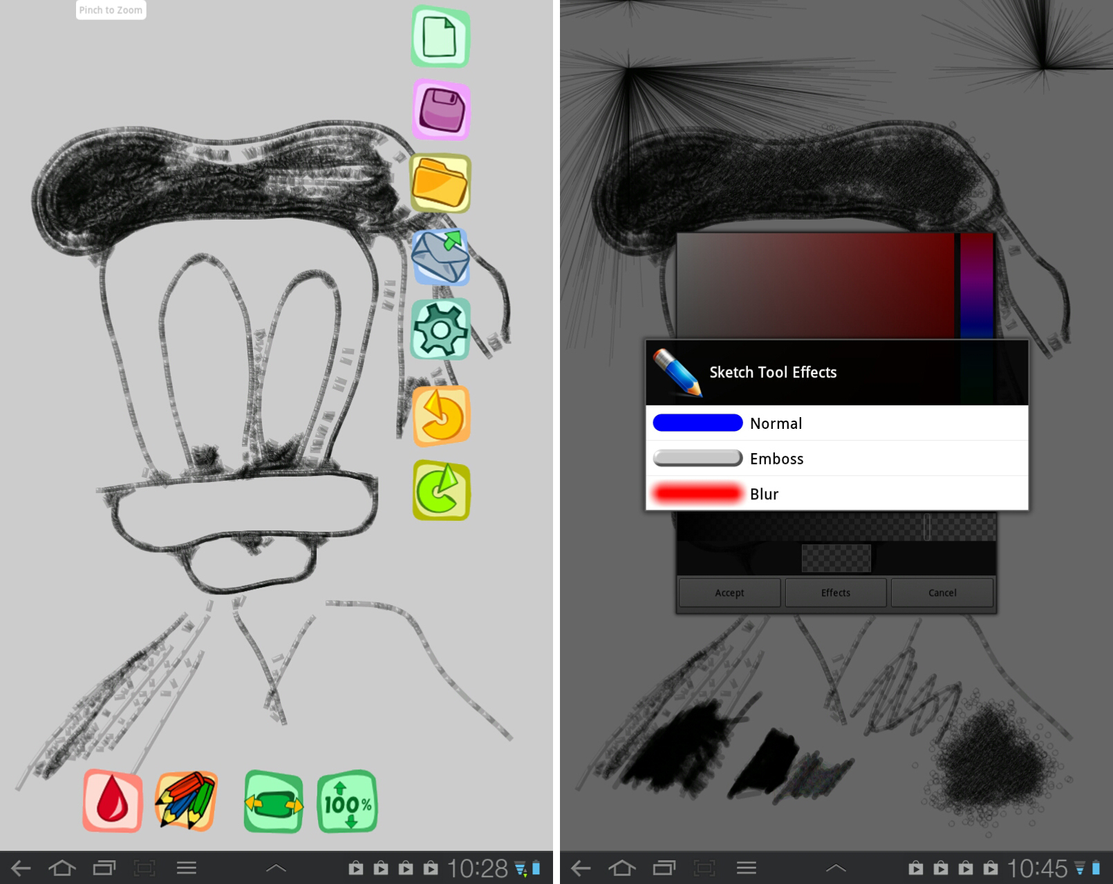 Sketch Pad ist nicht irgendeine Zeichen-App, sie ist erstens für Tablets optimiert und bietet zweitens zahlreiche Brushes (Pinselspitzen). Das geht von skizzenhaften Spitzen, über Bleistiftspitzen, Chrome, Ribbon, Dashes bis hin zu Kreisen und Rechtecken. In Kombination mit Farben und den drei Zeicheneffekten „Normal“, „Prägung“ und „Unschärfe“ ergeben sich unzählige Möglichkeiten ein Kunstwerk zu kreieren.