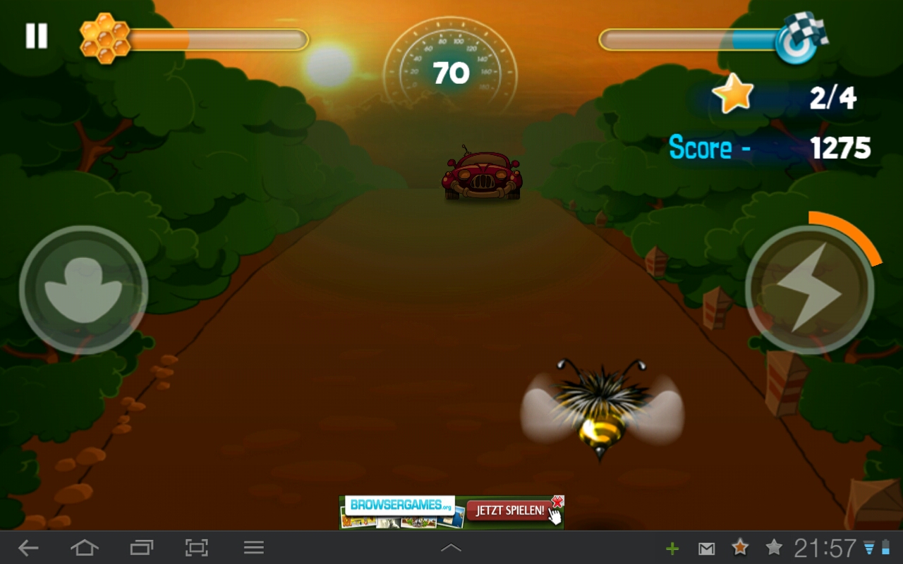 In diesem Spiel übernimmst du die Steuerung einer Hummel, die komischerweise nicht im Grünen nach Honig sucht, sondern auf einer stark befahrenen Straße. Dass sie dann ab und an recht unsanft auf einer Windschutzscheibe landet, liegt auf der Hand. Aber du kannst den direkten Kontakt mit den Fahrzeugen wenigstens auf ein Minimum reduzieren, indem du die Hummel auf ihrem Trip über die Landstraße nach links und rechts lenkst und somit an den entgegenkommenden Fahrzeugen vorbei.