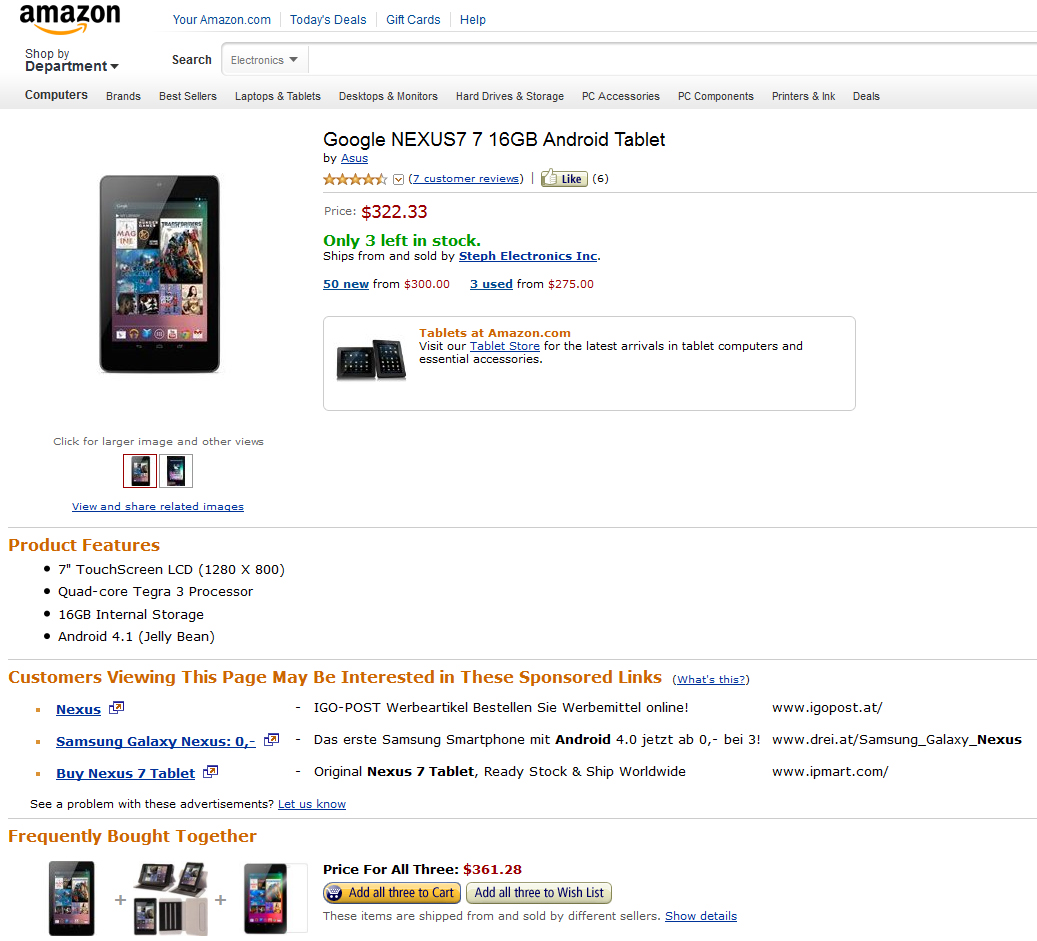 Vor wenigen Wochen haben wir darüber berichtet, dass Amazon überlegt, das Nexus 7 eventuell nicht anzubieten, da man sich damit die direkte Konkurrenz ins Haus schleppt. Allerdings scheint sich der Online-Händler nun doch dazu durchgerungen zu haben das Gerät anzubieten, denn in Amerika kann das Gerät schon über Amazon gekauft werden.