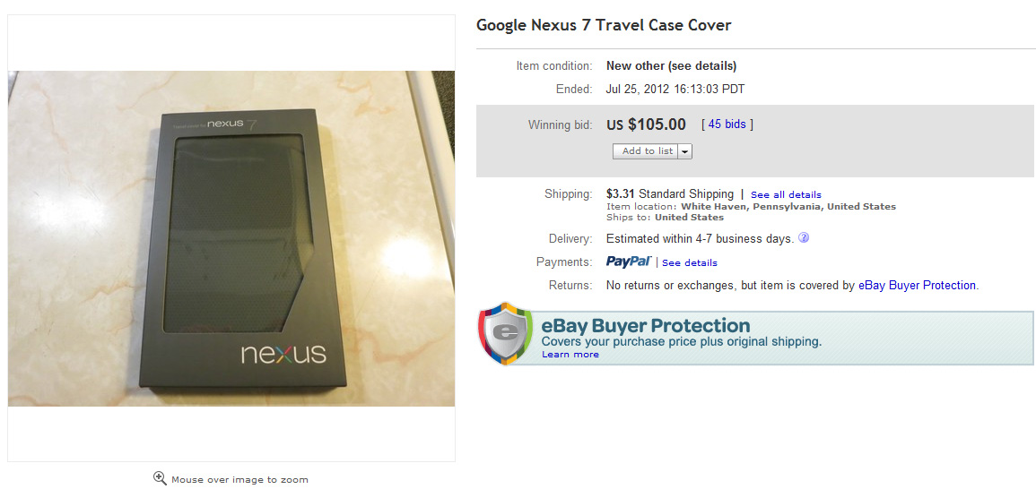 Der Verkauf des Nexus 7 ist bereits vor Wochen in Amerika gestartet. Allerdings war das Gerät, aufgrund der enormen Nachfrage, innerhalb von kurzer Zeit ausverkauft. Jetzt wird die Hülle, welche es optional dazu gab, sehr hoch gehandelt.Stolze 100 Dollar muss man derzeit bei eBay auf den Tisch legen, um sich ein bisschen Nexus 7-Feeling nach Hause holen zu können. Das Kuriose dran ist, dass die Hülle zu Beginn eigentlich nur 20 Dollar kostete. All jene, die solch eine Hülle haben wollen, haben drei Möglichkeiten: Entweder sie kaufen sich ein Nachbau-Produkt von Amazon oder warten auf darauf, bis das Gerät mit den Hüllen wieder lieferbar ist. Die letzte Möglichkeit wäre, die Hülle auf eBay zu ersteigern. Die derzeitigen Angebote werden zwischen 60 und 100 Dollar gehandelt.