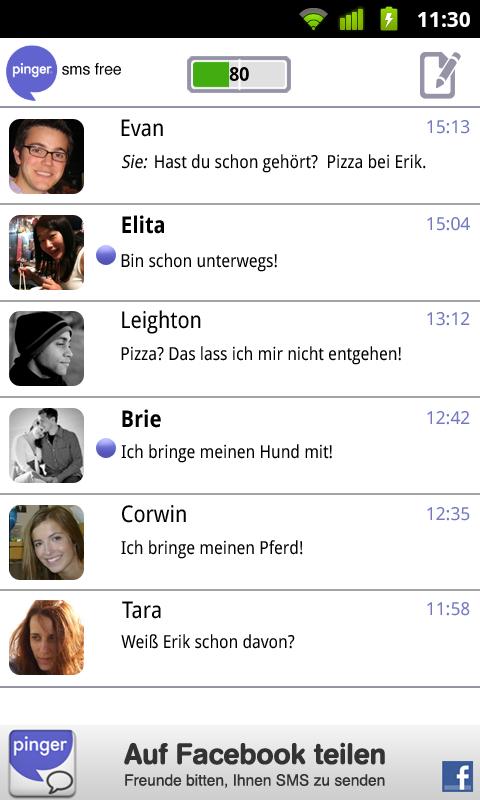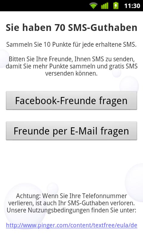 Doch was passiert, wenn sich der Punktestand auf die 0-Punkte-Marke hinbewegt? Dann gibt es sofort eine Nachricht von Pinger mit dem Hinweis, sein Freunde über Facebook aufzufordern, neue SMS zu schicken, um den Dienst weiterhin nutzen zu können. Es gibt übrigens auch keine Kostenfalle, denn wenn die Punkte aufgebraucht sind wird der Dienst nicht etwa kostenpflichtig, es ist hingegen dann einfach nicht mehr möglich weitere Nachrichten zu versenden.