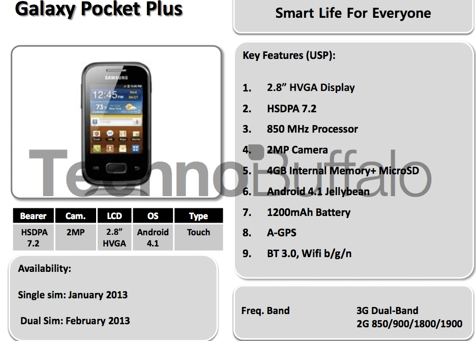 Auch Einsteiger-Smartphones hat Samsung für dieses Jahr wieder geplant. Zum einen gehört da das Galaxy Young, zum anderen das Galaxy Pocket Plus dazu. Das Young ist mit einem 1 GHz-Prozessor, 3 Zoll Display, 3 MP Kamera, 1300 mAh Akku sowie 4 GB internen Speicher und Android 4.1 ausgestattet. Das Gerät soll ab April verfügbar sein. Das Pocket Plus ist noch eine Spur schwächer in Sachen Leistung. Das Smartphone ist nur 2,8 Zoll groß und verfügt über einen Prozessor mit 850 MHz. Weiters gibt es 4 GB internen Speicher, eine 2 MP Kamera sowie Android 4.1. Der Akku ist mit 1200 mAh ausreichend bemessen. Die Single-SIM-Variante soll noch dieses Monat kommen, während die Dual-SIM-Version erst im Februar erscheinen soll.