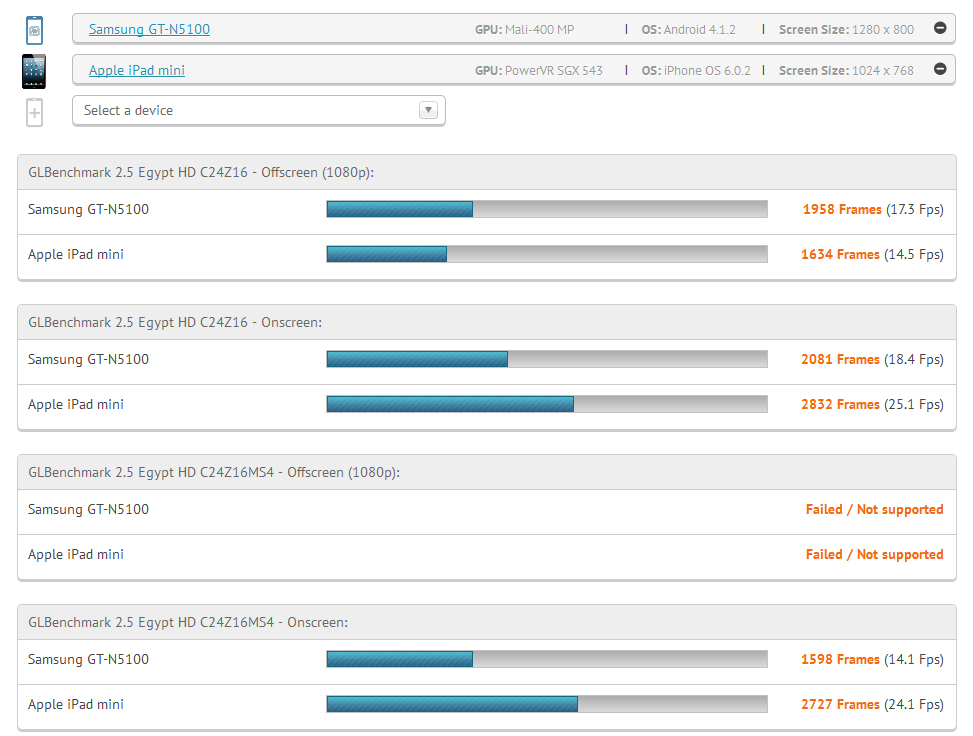 Doch nicht nur die Specs wurden veröffentlicht, auch ein Benchmark ist aufgetaucht. Genauer gesagt handelt es sich um einen GLBenchmark-Test. Wie eingangs erwähnt, will sich das Note 8.0 gegen das iPad mini behaupten, was laut den Benchmarks nur bedingt gelungen ist.