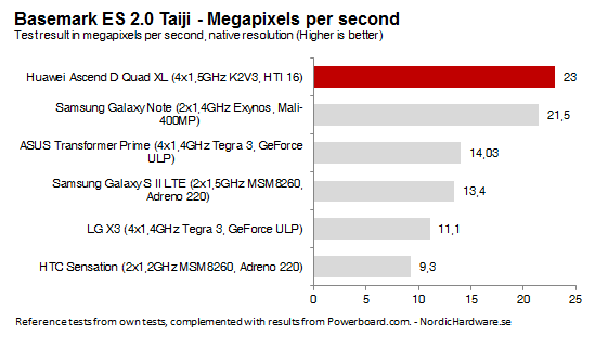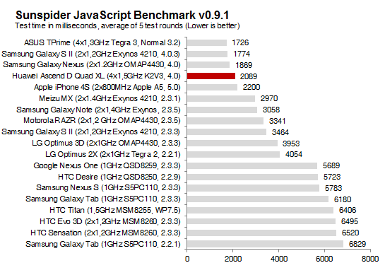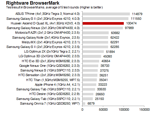 Außerdem hat nordichardware noch einen Sunspider Test durchgeführt auf dem das Smartphone den vierten Platz belegte. Ganz vorne ist das Transformer Prime, dicht gefolgt vom Galaxy S2 sowie Galaxy Nexus. Zwischen den ersten drei Geräten liegen ca. 100 Millisekunden. Selbst das iPhone 4S muss sich geschlagen geben und liegt mit 2200 Millisekunden auf dem 5. Platz. Ein ähnliches Ergebnis ist auch im Rightware BrowserMark zu sehen. Das Transfromer Prime ist erneut erster, direkt dahinter das S2 und danach schon der Konkurrent aus China.