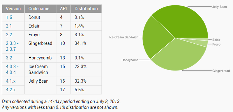 Google hat die Daten zur Versionsverteilung während einer 14-tägigen Periode mit Ende 8. Juli 2013 gesammelt.