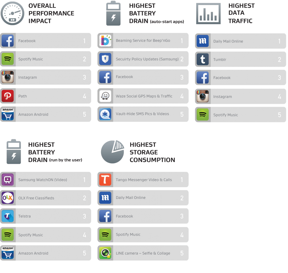 Viele beliebte Apps befinden sich auf der Liste der leistungshungrigsten Programme. (Grafik: AVG Technologies)