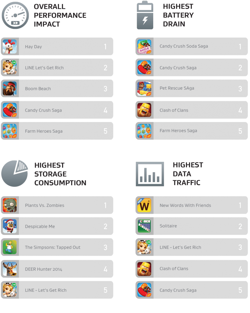 Dies sind die Spiele mit dem größten Verbrauch an Strom, Speicherplatz und Datenvolumen. (Grafik: AVG Technologies)