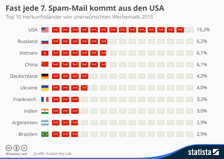 55 Prozent der im Vorjahr verschickten E-Mails sind laut Kaspersky-Spam Report 2015 unerwünschte Werbe- oder andere Spam-Mails. Und wo kommen sie her? Zum Großteil aus den USA. Mit 15,2 Prozent am globalen Spam-Aufkommen sind die USA Weltmeister im Verschicken von Spam-Mails.