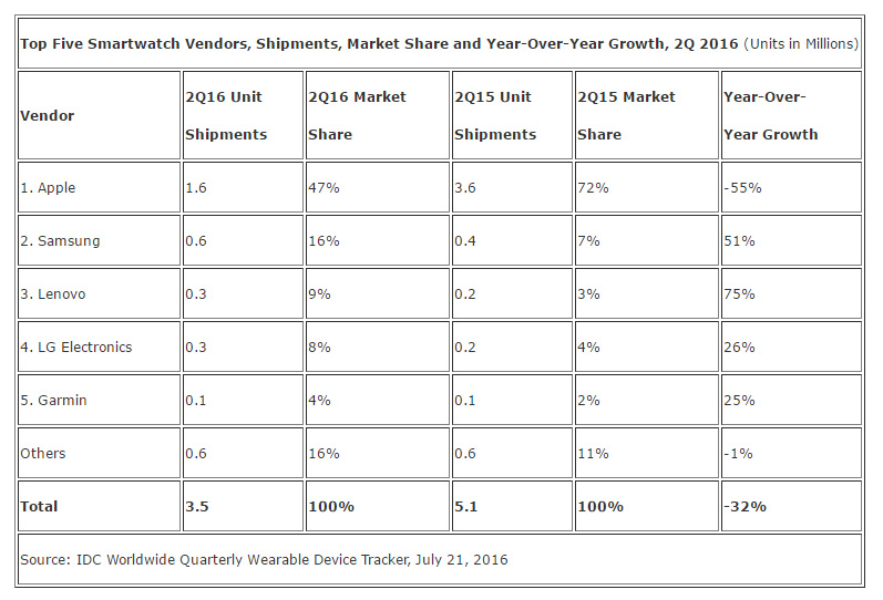3,5 Millionen Smartwatches wurden laut eine Veröffentlichung von IDC weltweit im vergangenen Quartal (April bis Juni 2016) abgesetzt. Viel ist das nicht. Und das Merkwürdige: Es war schon mal mehr. Denn die 3,5 Millionen entsprechen einem Rückgang von 32 Prozent gegenüber dem Vergleichsquartal im Vorjahr. Und wer ist schuld daran?