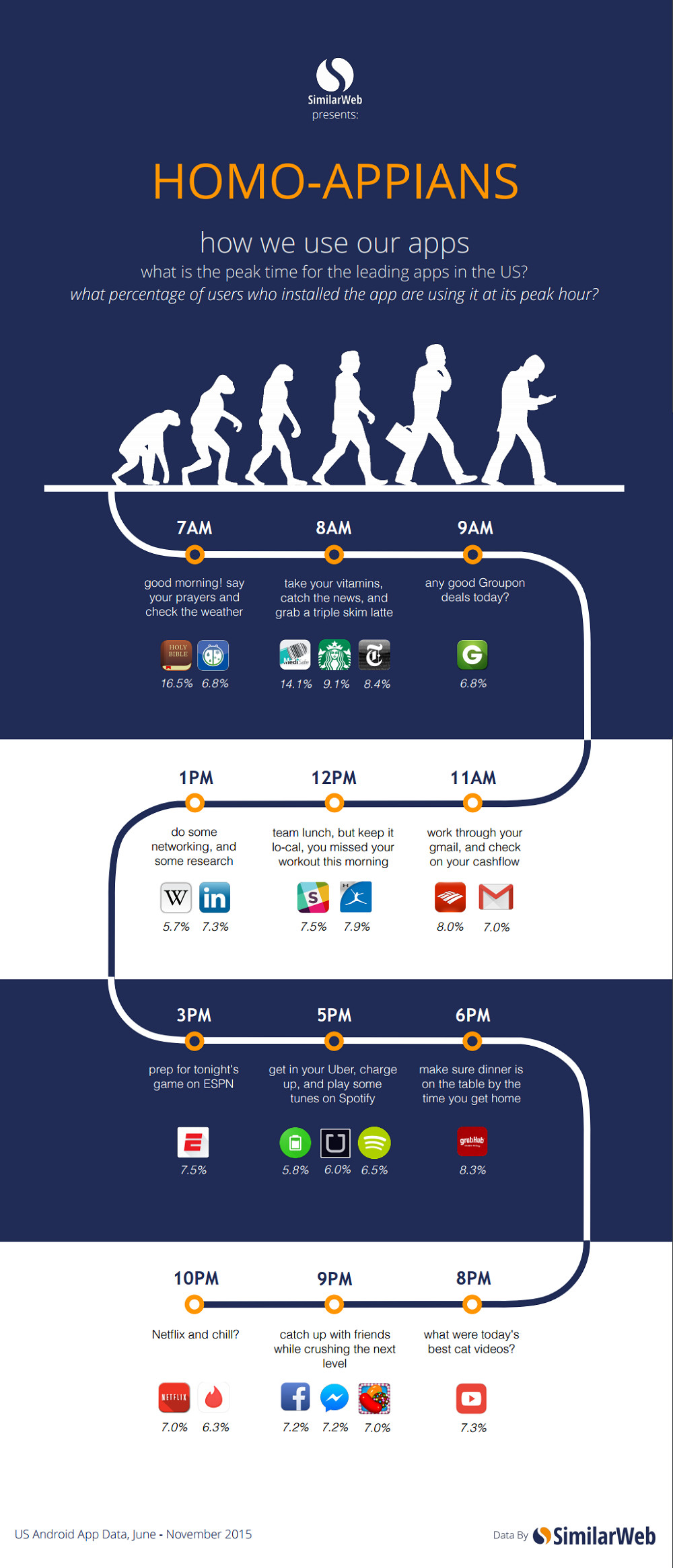Das Datenanalyseunternehmen SimilarWeb hat eine schöne Infografik veröffentlicht, die das tägliche App-Nutzungsverhalten eines durchschnittlichen Android-Anwenders zeigt. Die zugrundeliegenden Daten beziehen sich auf Anwender in den USA und wurden von Juni bis November 2015 gesammelt. Konkret hat das Unternehmen die in den USA „führenden Apps“ untersucht und herausgefunden, zu welchen Uhrzeiten diese Apps jeweils am häufigsten verwendet werden.
