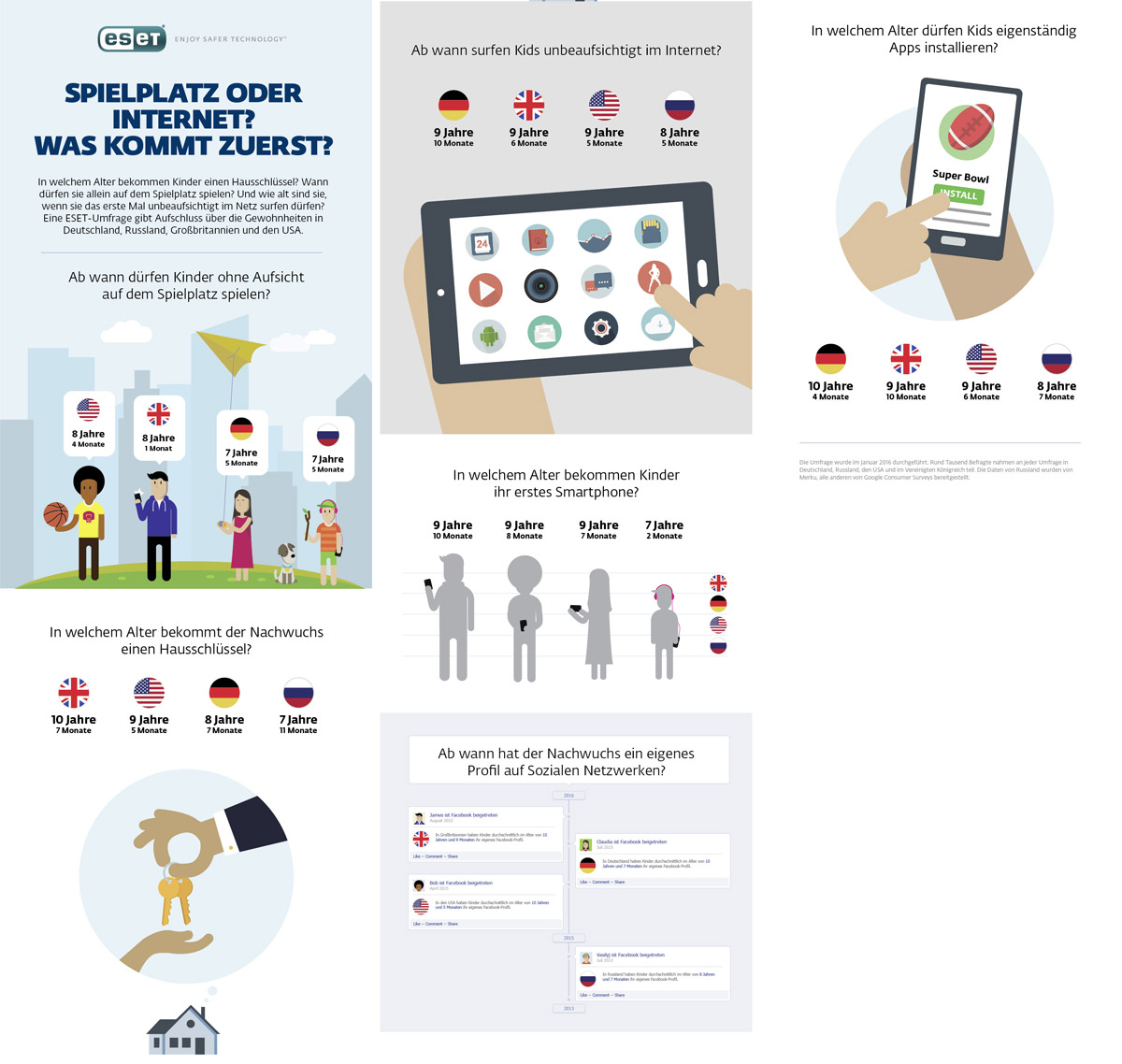 Ab welchem Alter lassen Eltern ihren Nachwuchs ohne Beaufsichtigung im Internet surfen oder ein eigenes Social-Media-Profil anlegen? Wann bekommt der Nachwuchs sein erstes eigenes Smartphone? Der Security-Software-Hersteller ESET hat dazu rund 1.000 Personen in Deutschland, Russland, UK und USA befragt.