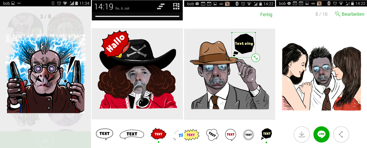 In der LINE-App werden zwei bei Jugendlichen beliebte Themen kombiniert: Selfies und Comics. 130 Illustrationen aus 17 Themen wie z.B. Hippster Boy, Knights, Mad Scientist, Wedding, Cheerleader, Skateboarder, usw. stehen zur Auswahl. Wir suchen also einen passenden Sticker aus und machen von uns selbst ein Porträtfoto. Ein Tipp auf OK und schon erscheint unser Konterfei in zahlreichen Stickern zum gewählten Thema. Die Porträts lassen sich noch mit Sprechblasen und selbst gewähltem Text versehen und natürlich mit Gott und der Welt teilen, etwa via LINE, aber auch über Facebook, Twitter, Instagram und sonstige Möglichkeiten des Teilens wie GMail, Drive und MMS.