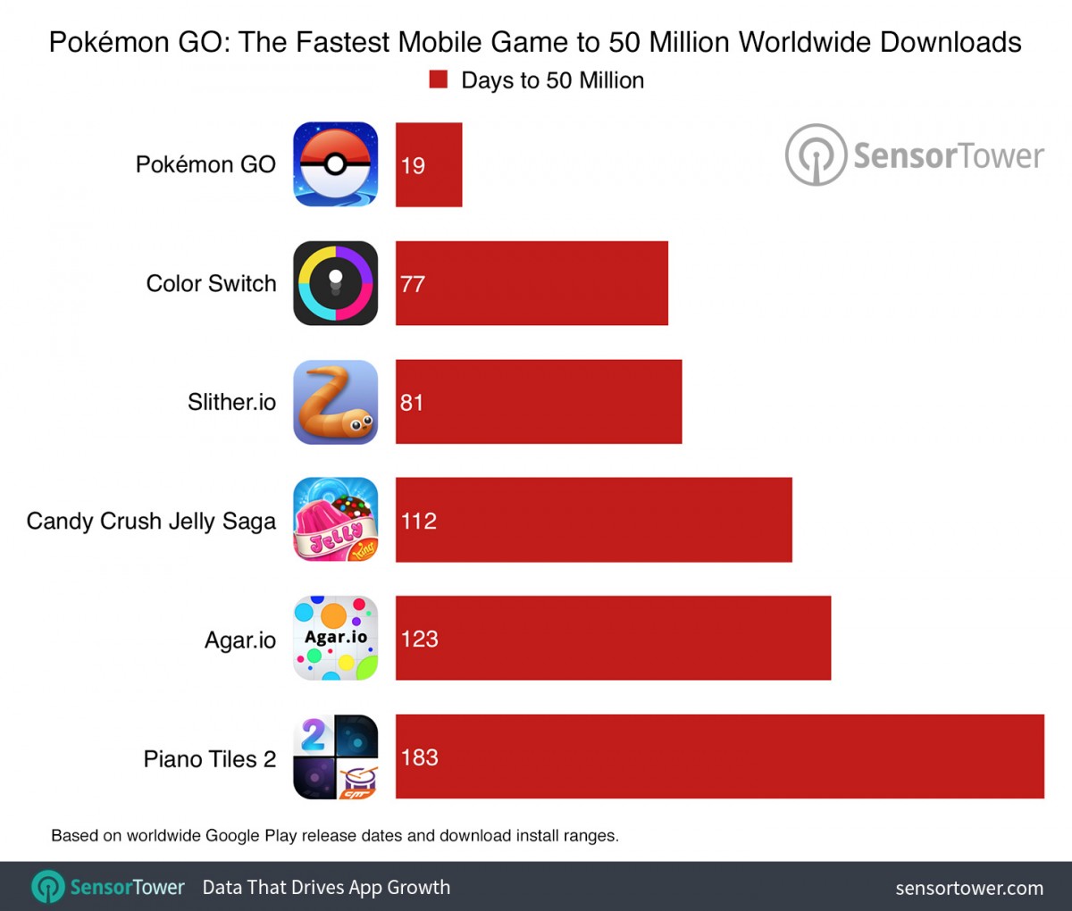 Auch wenn der Launch von Pokémon Go aufgrund des Hypes und der befürchteten Serverüberlastung gestaffelt verlief, die Grenze von 50 Mio. Downloads wurde so schnell erreicht wie bei keinem anderen Spiel zuvor.