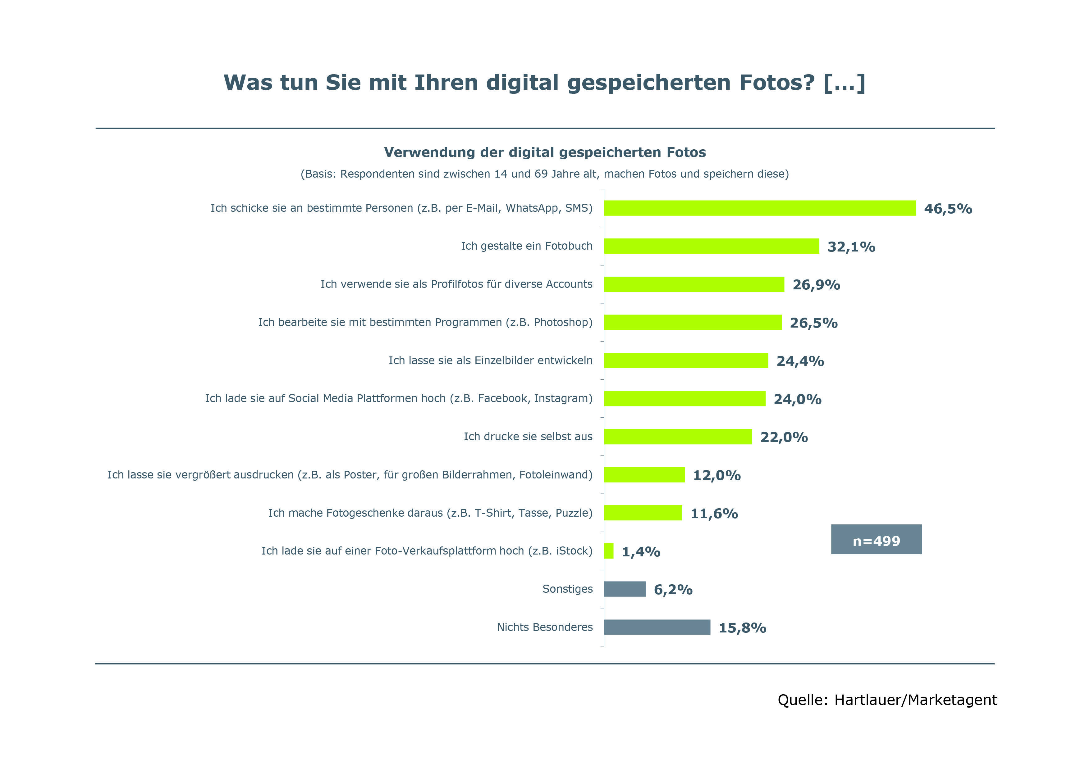 In erster Linie (46,5 %) werden digitale Fotos an andere Personen verschickt, sei es per WhatsApp, Email oder andere Kommunikationsmittel. 32,1 % gestalten ein Fotobuch, 26,9 % nutzen die Fotos als Profilbilder, 26,5 % bearbeiten sie mit Programmen oder Apps. 24,4 % der Befragten lassen die Einzelbilder entwickeln, 24 % laden die Fotos auf Facebook und anderen sozialen Netzwerken hoch, 22 % drucken sie selbst aus und 15,8 % lassen die Fotos einfach gespeichert und machen damit nichts Besonderes.