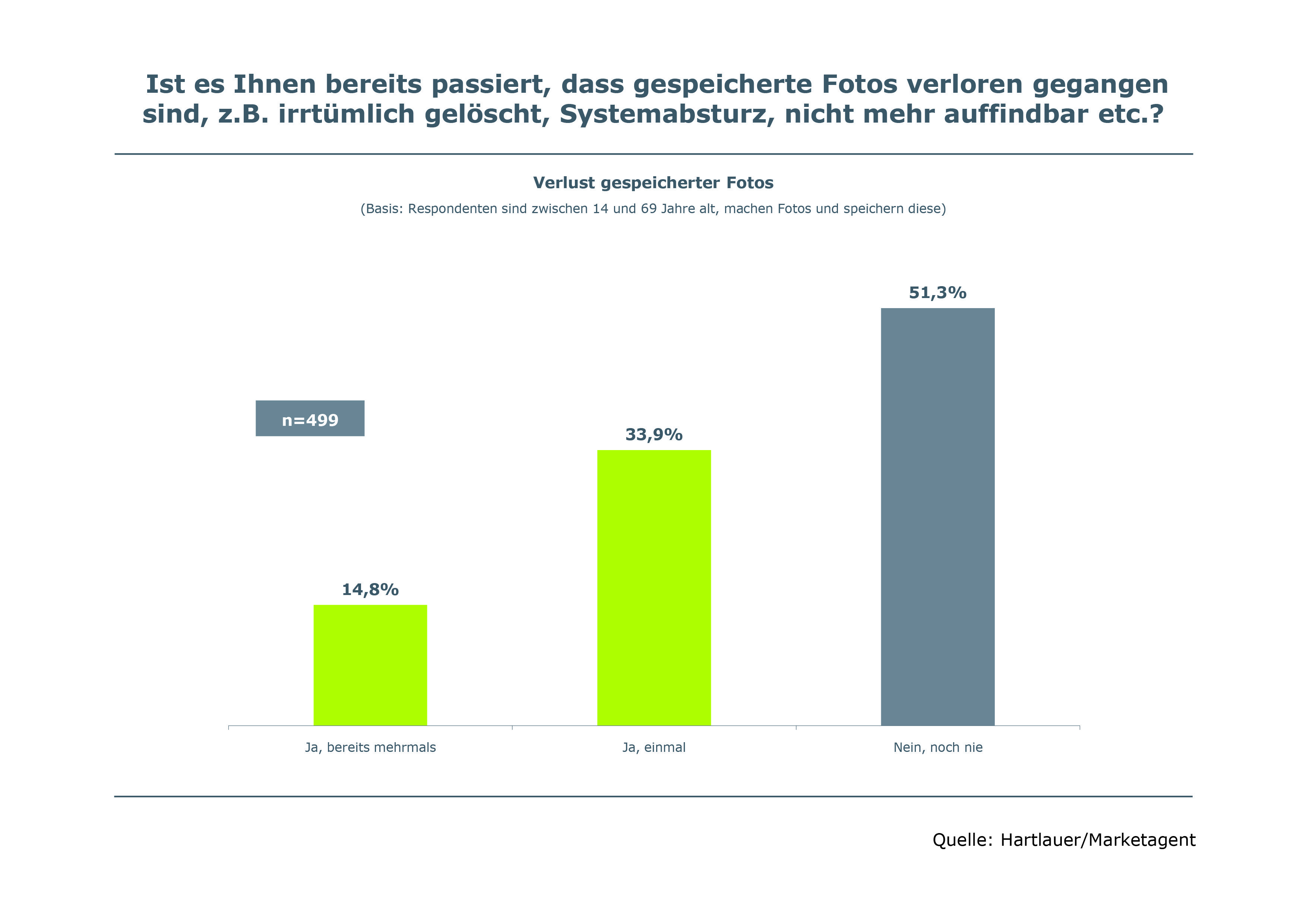 Knapp jeder Zweite hat im Rahmen der Befragung angegeben bei Fotos schon einmal einen Datenverlust erlitten zu haben. 14,8 % geben sogar an, schon mehrmals Fotos verloren zu haben. Dabei ist vor allem die jüngste Altersgruppe (14-19 Jahre) sehr häufig davon betroffen. Die Ältesten (60-69 Jahre) setzen sich etwas intensiver mit der Materie auseinander und müssen deutlich weniger oft einen Datenverlust hinnehmen.