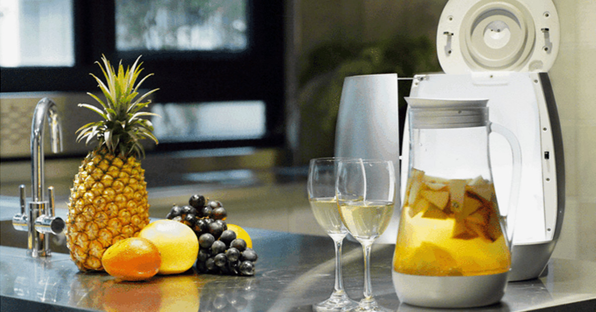 Zu diesem Zweck wählst du zunächst in der dazugehörigen Smartphone-App ein Rezept aus. Dann füllst du in den speziellen Alchema-Behälter die angegebenen Bestandteile ein – also die jeweiligen Früchte sowie Zucker, Wasser und Hefe. Der 40 Zentimeter hohe Behälter verfügt über einen Gewichtssensor, dank dessen die App das Gewicht der eingefüllten Früchte anzeigen kann.