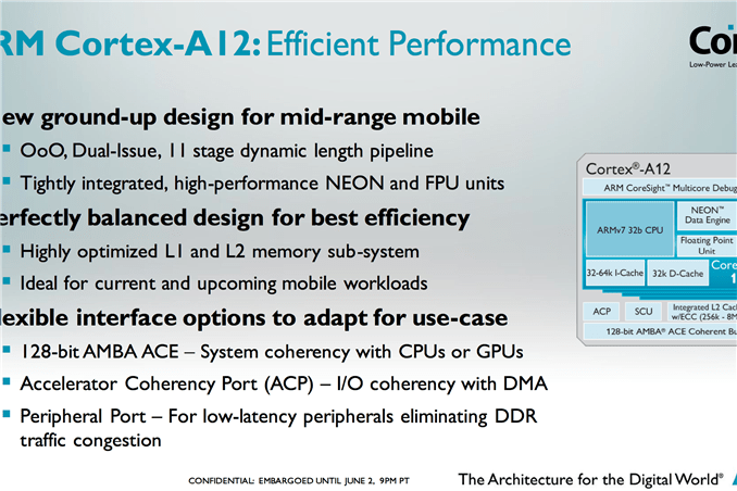 Obwohl ARM bisher keine detaillierten Informationen über die Architektur des Prozessors herausrückt, verspricht der Hersteller eine Performancesteigerung von bis zu 40 Prozent. Der Energieverbrauch soll “dem des A9 ähnlich sein”. In Kombination mit der höheren Rechenleistung soll (aufgrund der kürzeren Rechenzeit) eine Laufzeitsteigerung auftreten – diese wurde vom Hersteller bisher aber noch nicht quantifiziert.