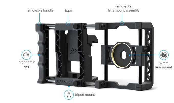 Dank cleverem Universal-Klemmmechanismus und einer variabel einstellbaren Linsenhalterung, ist Beastgrip Pro mit nahezu allen Smartphones kompatibel. Beastgrip Pro bietet einen ergonomischen Griff, einen Blitzschuh sowie eine Stativaufnahme. Das alles kann zudem dank der modularen Bauweise passgenau auf die individuellen Bedürfnisse zugeschnitten werden. Mit den eigens entwickelten Adaptern lassen sich sogar SLR-Objektive vor das Smartphone spannen.