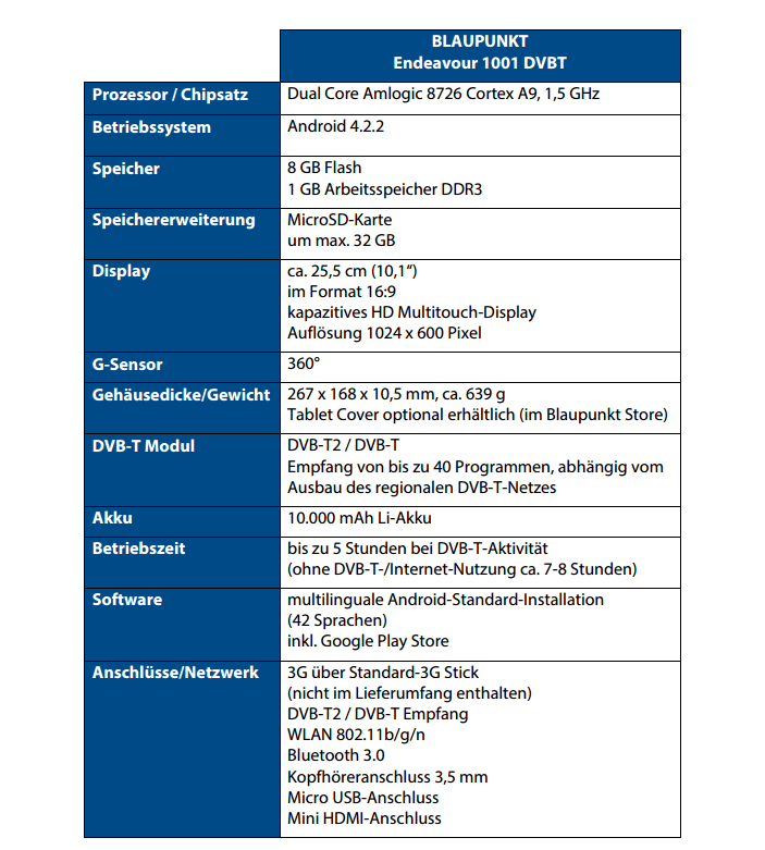 Und auch wenn in Deutschland erst 2016 mit dem Empfang von DVB-T2-Signalen (dem Nachfolger von DVB-T – mit verbessertem und robusterem Signal) zu rechnen ist, ist das Blaupunkt-Tablet bereits jetzt hierfür ausgestattet. Damit der Fernsehvergnügen nicht abrupt beendet wird, wurde das Gerät mit einem 10.000 mAh ausgestattet, der bis zu fünf Stunden TV-Empfang verspricht.