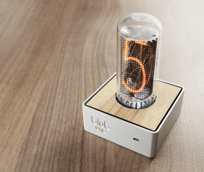 Da es sich um eine Nixie-Röhre handelt, zeigt die Blub Uno jeweils nur eine Ziffer der aktuellen Uhrzeit. Um ein Beispiel zu geben: Die Uhrzeit 12:30 Uhr würde als „1… 2…3…0“ angezeigt werden. Sicher nicht die praktischste Art und Weise, die aktuelle Uhrzeit anzuzeigen, doch die Blub Uno zieht ihre Daseinsberechtigung ohnehin mehr als Eyecatcher denn als praktischer Zeitmesser. Neben der Uhrzeit kann die Blub Uno außerdem auch das aktuelle Datum anzeigen, hat einen Wecker und Temperaturmesser integriert, besitzt eine farbliche Hintergrundbeleuchtung und kann – für die ganz Faulen unter uns – auch durch die mitgelieferte Fernbedienung gesteuert werden. Falls die Röhren mal den Geist aufgeben, wird man sie auch einfach wechseln können. Laut Macher soll es Austausch-Röhren geben.