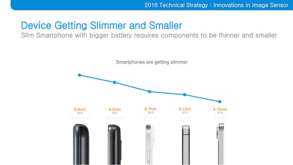 Der neue Sensor wurde um 17 Prozent in der Höhe geschrumpft, während die gleiche Lichtsensibilität beibehalten wird. Damit wird auch die Erhebung an der Rückseite etwas kleiner, wenn sie auch nicht gleich gänzlich verschwindet.