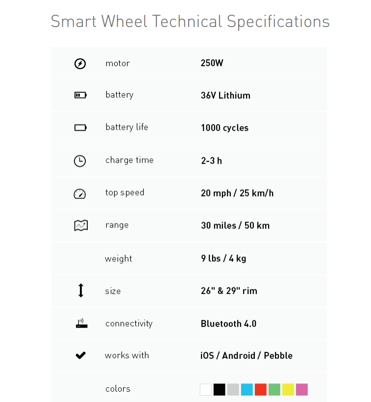 Über eine iOS-,  Android- oder Pebble-App wird das Fahrrad gesteuert, zumindest die Geschwindigkeit, genaugenommen nur die Höchstgeschwindigkeit. Das Maximum sind 32 km/h über eine Distanz von 48 Kilometer. Um den Motor aufzuladen, soll angeblich gelegentliches Treten in die Pedale ausreichen. Das Smart Wheel lässt sich aber natürlich auch über ein Stromnetz aufladen.
