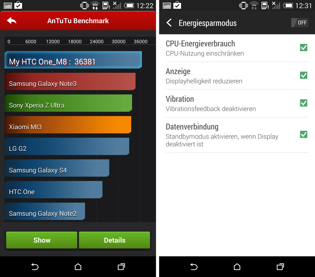 Linker Screenshot: In Benchmarks wie hier bei AnTuTu macht das HTC One (M8) dank Snapdragon 801 eine sehr gute Figur. Rechter Screenshot: Wie beim Vorgänger kann die Akkulaufzeit dank integriertem Energiesparmodus verlängert werden.