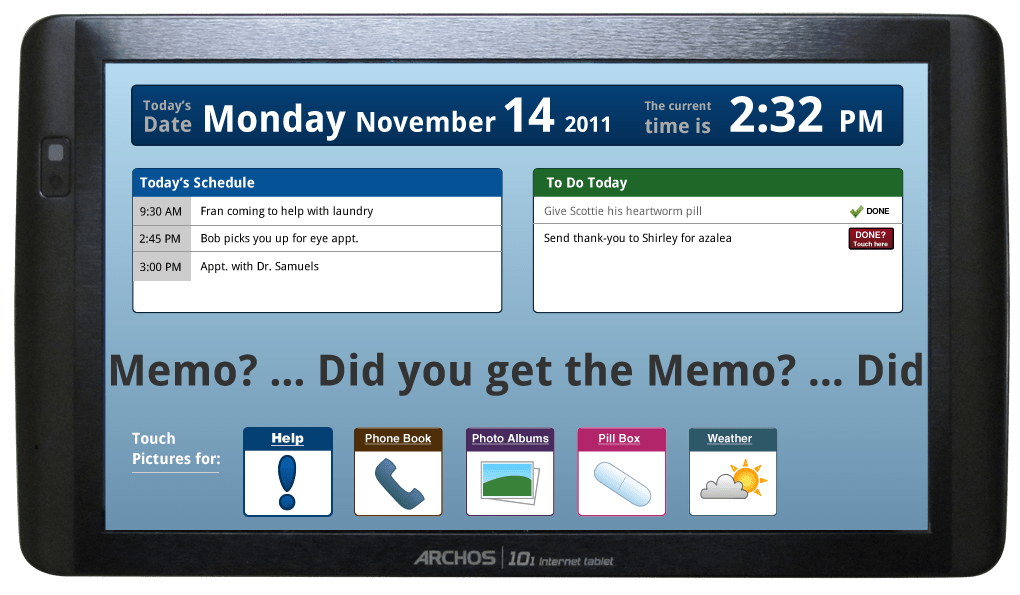Benutzer sehen auf der Startseite auf einen Blick, welche Termine und Tätigkeiten sie an diesem Tag erwarten. Dazu stehen ihnen auch eine Wetterprognose, ein Medikamentenplaner, eine Fotogalerie und ein Telefonbuch zur Verfügung. Ein Lauftext blendet jeweils eine Nachricht gut sichtbar ein.