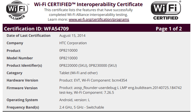 Doch das alleine ist noch nicht alles. Es gibt auch noch einen neuen Leak der Wi-Fi Alliance, bei dem ein HTC-Gerät mit Android L gesichtet wurde. Dabei handelt es sich um ein Tablet, welches als das nächste Nexus-Gerät auf den Markt kommen könnte. Auch hier ist bei der Firmware-Version das Schnipsel „LMP“ zu erkennen.