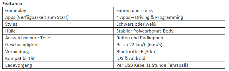 Und natürlich kann Ollie nicht nur fahren, er kennt auch Tricks wie Springen, Flippen und Driften. Gesteuert wird der kleine Roboter via App, die es für Android und iOS gibt. Geladen wird er via USB. Und die Verbindung zwischen ihm und dem Smartphone funktioniert per Bluetooth LE (Low Energy), d.h. sie funktioniert bis zu einer Entfernung von 10 Metern. Bluetooth LE ermöglicht auch den sofortigen Verbindungsaufbau, indem man das Smartphone oder das Tablet ganz einfach neben Ollie legt.