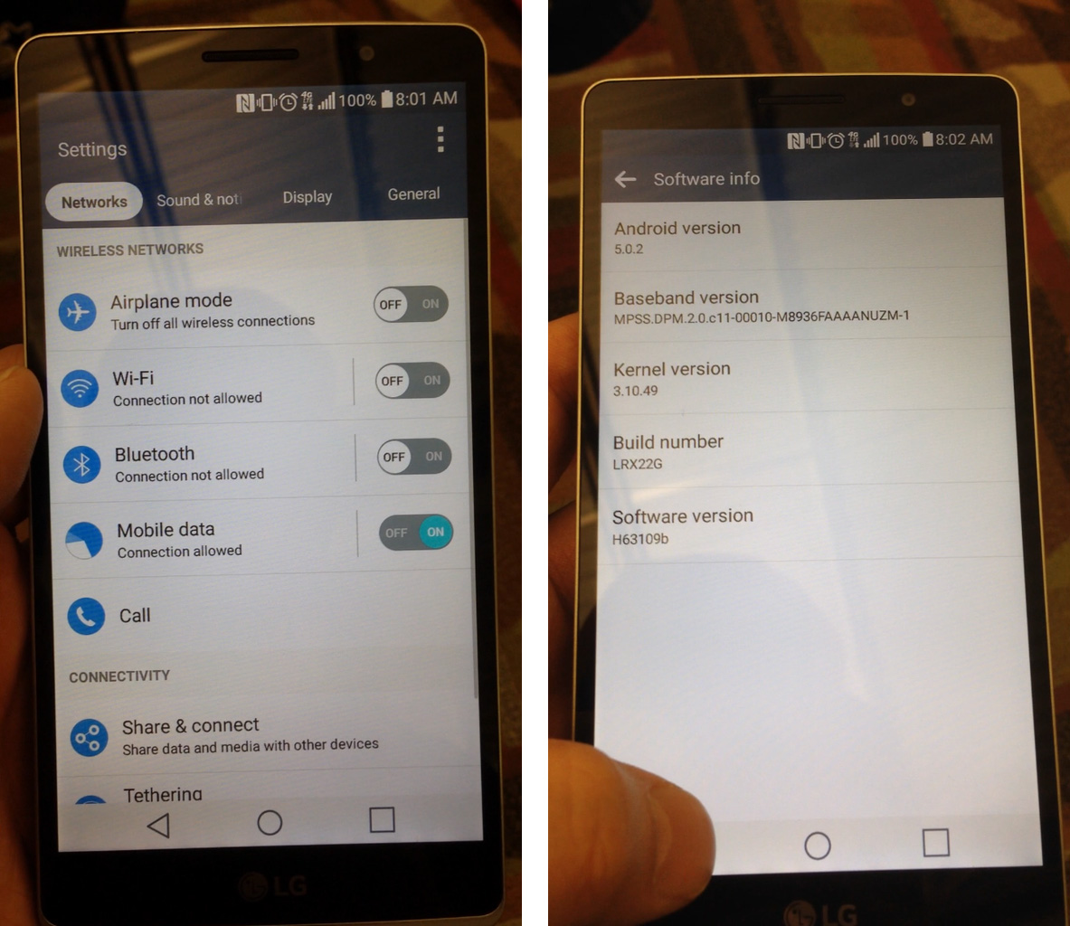 Doch genug der Spekulationen, widmen wir uns den Fakten die zumindest das Gerät auf dem Foto betreffen. Auf der Frontseite ist wieder ein sehr großes Display mit einer vermutlich sehr hohen Auflösung von 2560×1440 Pixel zu sehen. Auf dem Display wird auch bereits die neueste Android-Version 5.0 Lollipop gezeigt, was uns natürlich besonders freut. Selbstverständlich ist auch die hauseigene Oberfläche dem Betriebssystem übergestülpt worden. Rückwärtig finden wir eine Kamera mit Laser-Fokus und LED-Leuchte vor. Natürlich sind auch die LG-typischen Tasten direkt unter der Linse angebracht. Wie bereits erwähnt ist auch ein Stylus mit an Bord, der an der Oberkante des Geräts untergebracht wird.
