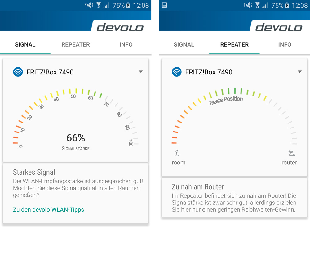Wenn trotz unterschiedlicher Standorte das WLAN-Signal nicht im gewünschten Raum ankommt, bleibt meist der Griff zu einem WLAN-Repeater nicht erspart. Um möglichst viel Reichweite aus dem WLAN-Repeater zu holen hat devolo den Reiter Repeater eingefügt. Dort wird wieder eine ähnliche Grafik angezeigt, allerdings wird hier die perfekte Position zwischen Router und gewünschtem Raum angezeigt.