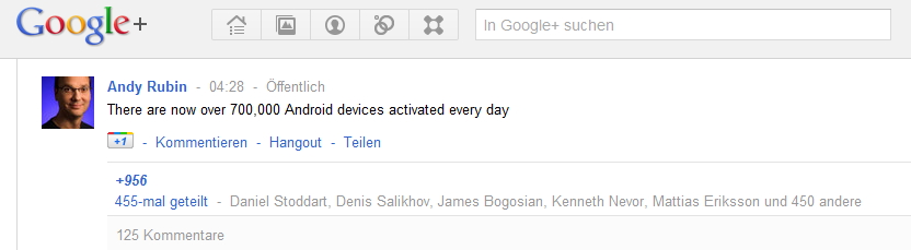 Die stolze Zahl von 700.000 Aktivierungen pro Tag hat übrigens der Entwickler von Android, Andy Rubin, auf Google+ bekanntgegeben. Und selbstverständlich wird jedes Gerät nur einmal gezählt. Das heißt zweimal oder öfter aktivierte Geräte zählen als eines. Und Aktivieren ist gleichzusetzen mit „kaufen“, so Rubin auf der Google+ Seite.