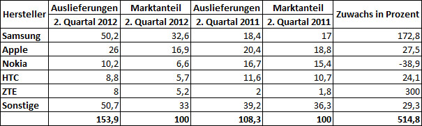 Samsung hat also im zweiten Quartal 2012 fast doppelt so viele Geräte verkauft, wie Apple. Überraschend ist auch, das ZTE HTC schon fast eingeholt hat. Man darf gespannt sein, wie sich die Auslieferungen und Marktanteile in Zukunft entwickeln, auch im Hinblick auf den Release des iPhone 5.