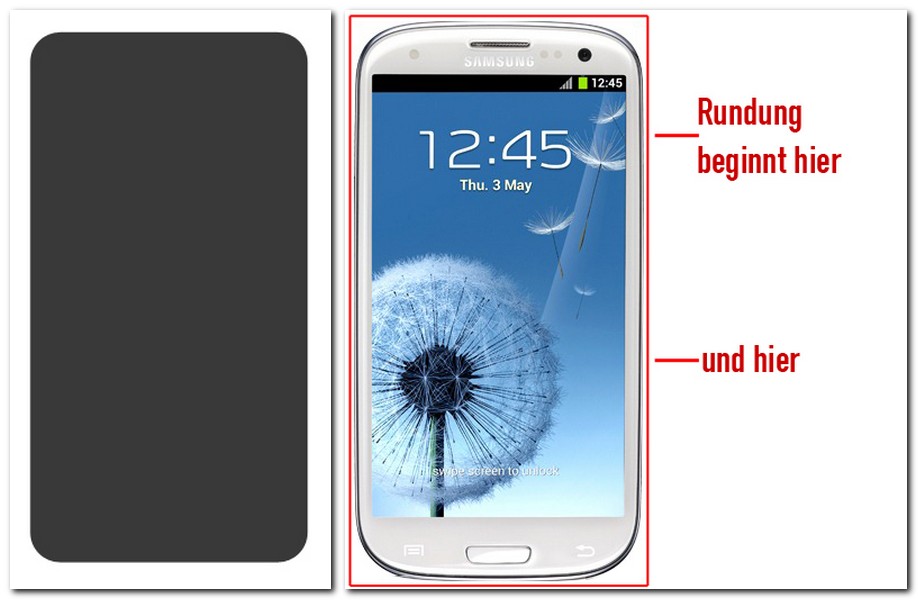 Das linke Bild zeigt die Richtlinie von Apple, rechts das SIII mit den ungleichen Rundungen