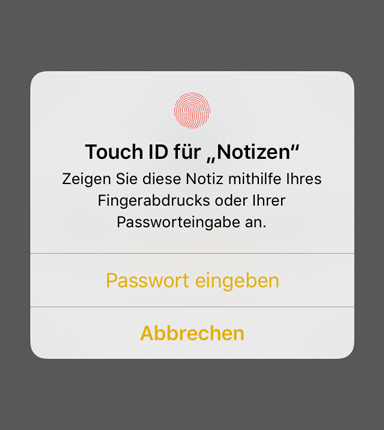 Um eine Notiz auf diese Weise zu sichern, tippt man im Eingabefenster auf den „Teilen“-Button und wählt „Notiz geschützt“. Beim ersten Mal wählt man das Passwort, das von da an für alle Notizen gilt. Außerdem legt man gegebenenfalls fest, ob der Inhalt auch per Fingerabdruck zugänglich werden soll.