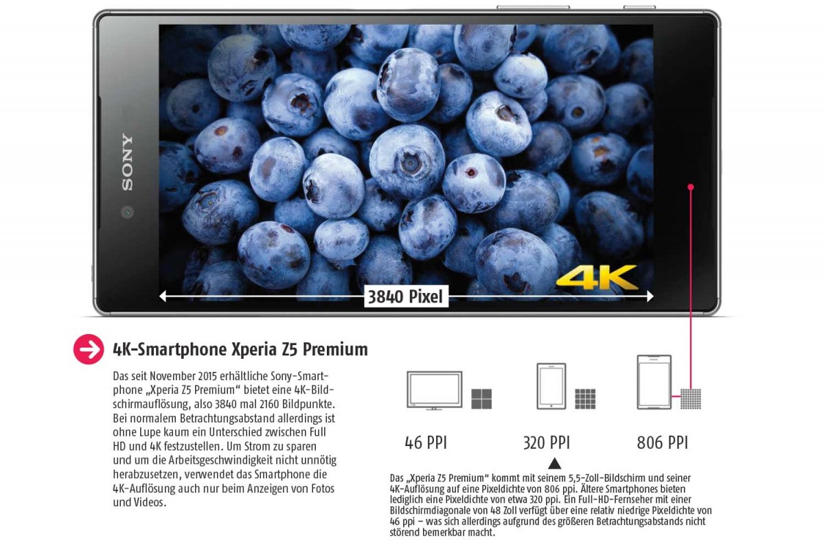 Wenn die Diskussion sich dann etwas beruhigt hat, können Sie sie erneut anfachen, indem Sie Smartphones mit hochauflösenden Bildschirmen erwähnen: Seit vielen Jahren liefern sich die Smartphone-Hersteller ein Wettrennen um immer höhere Bildschirmauflösungen. Und tatsächlich gibt es jetzt mit dem „Xperia Z5 Premium“ von Sony bereits ein Smartphone, das über eine 4K-Auflösung verfügt. Das entspricht bei der Bildschirmdiagonale von 5,5 Zoll einer Pixeldichte von etwa 800 ppi. Und das, obwohl das menschliche Auge bei normalem Betrachtungsabstand spätestens ab ungefähr 450 ppi keine störenden Bildpunkte mehr erkennen kann. Und für das unbewaffnete Auge bei dieser Bildschirmgröße kaum ein Unterschied zwischen Full HD und 4K feststellbar ist.