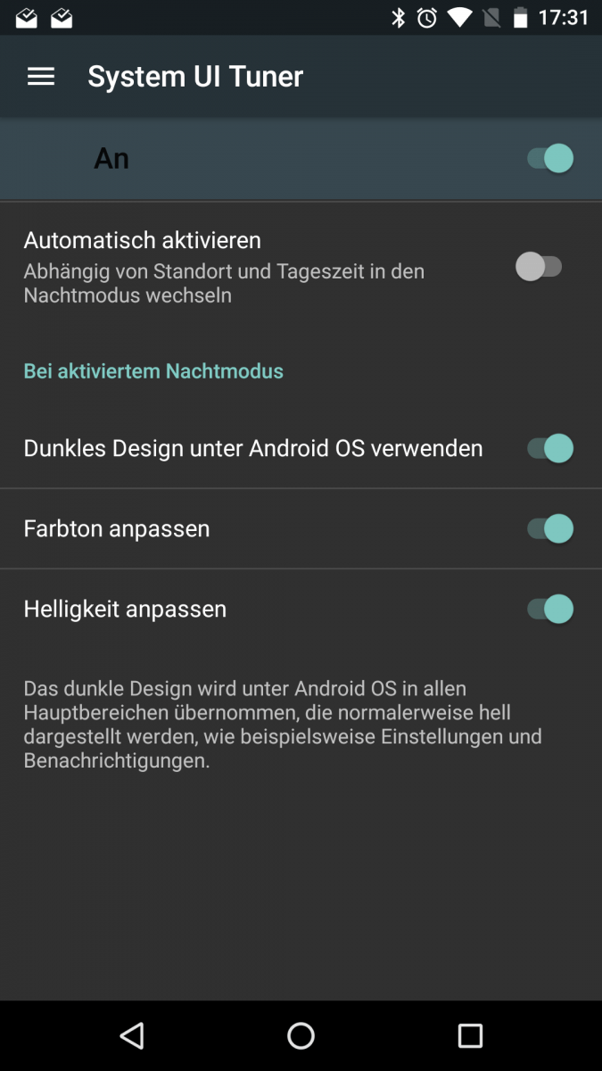 Der neue Nachtmodus in Android N lässt sich entweder händisch über eine Kachel in den Schnelleinstellungen aktivieren oder automatisch einschalten (wobei sogar auf den Aufenthaltsort und die Zeitzone Rücksicht genommen wird). Wie die Oberfläche durch den Nachtmodus genau angepasst wird, lässt sich einstellen: Entweder das Farbschema wechselt auf ein „Dark Theme“, die Farben werden auf einen angenehm rötlichen Ton angepasst, die Helligkeit wird heruntergeschraubt – oder eine Kombination dieser drei Dinge.